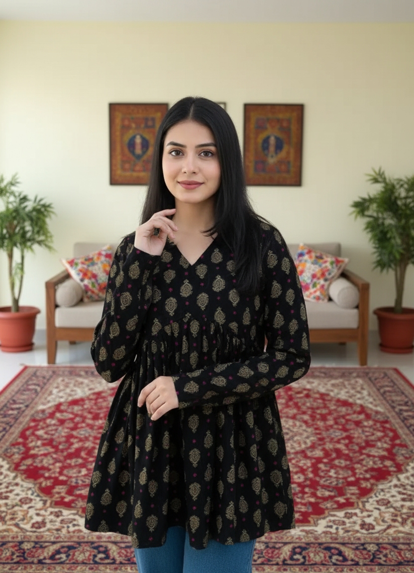 Elevate your formal and fusion wardrobe with this chic Black Printed Women’s Top. Crafted from soft and breathable viscose fabric, it ensures all-day comfort while keeping your style effortless. The V-neckline and round hem add a modern touch, making it perfect for pairing with trousers, skirts, or jeans.